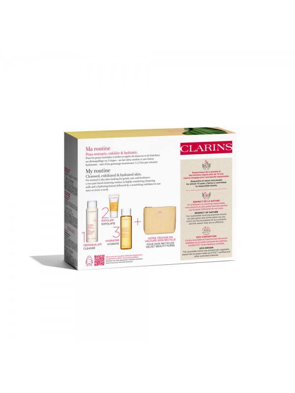 Cofre Neteja Pells Normals: Llet desmaquillant 200 ml + Loció Tonica Hidratant 200 ml + crema exfoliant confort 15 ml Llet fina i untuosa desmaquillant enriquida amb el nou duet Gentle Complex (extractes de genciana groga bio i melissa bio), provinent de la nostra Hisenda Clarins , que elimina el maquillatge de forma suau i confortable i preservant la microbiota cutània. Loció tònica per a pells normals o seques que ajuda a restaurar l'equilibri de la microbiota cutània gràcies al revolucionari Microbiote complex (ingredients marins i polifenols de safrà), alhora que reequilibra el tipus de pell, deixant-la saludable i bella. Enriquida amb extractes d'àloe vera bio i figa bio que hidraten la pell, deixant-la suau i fresca. Elimina les restes del maquillatge i retira les partícules de contaminació Preserva i reequilibra la microbiota cutània