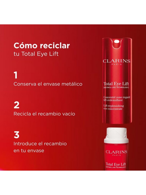 Total Eye Lift és el tractament expert que transforma visiblement la mirada en només 30 segons*, gràcies a una doble innovació en ciència i fórmula. Incorpora la [RETINOL-LIKE TECHNOLOGY] , amb un potent extracte d'harungana bio tan eficaç com el retinol** i suau per al contorn dels ulls. Aquest actiu, amb eficàcia patentada***, potencia la producció de col·lagen x12****. Es combina amb un nou extracte de Jania vermella procedent de la biotecnologia per a un efecte lífting de llarga durada. La seva textura bàlsam forma una xarxa tensora sobre la pell (PRO-TIGHTENING MATRIX) per a un efecte lífting immediat, l'eficàcia de la qual ha estat provada mitjançant un nou protocol de test real Clarins . Aquesta recàrrega s'ha d'utilitzar exclusivament amb el pot original de Total Eye Lift*****. *Autoavaluació, percebuda per 111 dones. **Estudi clínic comparatiu realitzat sobre l'eficàcia antiarrugues i allisadora amb 46 dones que aplicaven una base amb extracte d'harungana bio o bé retinol amb un % d'ingredients idèntic al del producte acabat - 56 dies. ***Dues patents emeses a França pertanyents a Clarins sobre l'eficàcia de l'extracte d'harungana. ****Test in vitro realitzat amb extracte d'harungana. *****La recàrrega no es pot utilitzar sola.