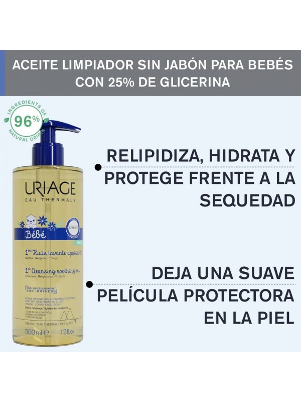 URIAGE 1er OLI NETEJADOR. "Aquest Oli Netejador nutritiu, neteja amb suavitat i protegeix la pell del nadó. La seva fórmula amb el complex natural [Agua termal de Uriage + Edelweiss orgánico] combinada amb agents suaus reposadors de lípids, protegeix la pell dels efectes dessecants de l'aigua deixant una pel·lícula protectora."