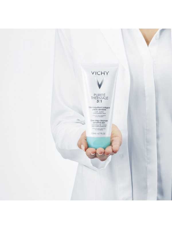 El desmaquillant integral de Pureté Thermale combina en un sol producte una llet netejadora + un tònic + un desmaquillant d'ulls, convertint-lo en el producte netejador perfecte per a dones que volen una neteja ràpida i profunda. Gràcies a la combinació d'agents netejadors ultraeficaços i ultrasuaus i amb una textura llet-gel molt fresca, ofereix una neteja i un desmaquillatge ràpid i fàcil, per eliminar de manera eficaç el maquillatge respectant la teva pell sensible.Perfectament desmaquillada i neta, la pell està fresca, suau i alleujada.PURETÉ THERMALE La línia de neteja de la cara i desmaquillants experta de Vichy, amb productes adaptats per a la pell sensible. Neteja profunda i eficaç, en una gran varietat de formats i fórmules. Enriquida amb la nostra aigua volcànica de Vichy, rica en 15 minerals i que reforça la pell contra les agressions externes, per a una pell més forta, visiblement més radiant i plena de vitalitat.