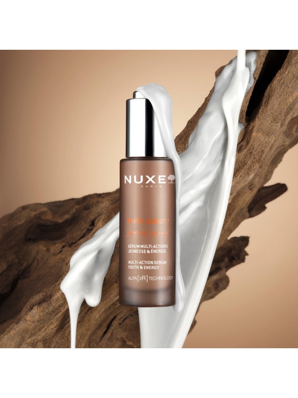 NUXE Men [BOOST] ³, la gamma experta que combina eficàcia i sensorialitat per revelar tota la força de la pell. Amb oli-extracte d'escorça de freixe patentat. A més, TECNOLOGIA ALFA [3R] ⁽¹⁾, més eficaç que el retinol⁽²⁾, revitalitza, renova i rejoveneix la pell. Aquest sèrum potència i enforteix la pell per a una eficàcia multiacció. Després de la seva aplicació, la pell queda hidratada i amb una aparença revitalitzada. Les arrugues semblen allisades, deixant la pell visiblement més jove i plena d'energia. La seva textura fluida i lleugera es fon a l'instant a la pell, sense sensació enganxosa ni greixosa. La seva fragància revitalitzant amb notes enfustades i refrescants potencia a l'instant l'energia de la pell. [3R] formulada i produïda a França. ⁽²⁾Prova in vitro. ⁽²⁾Prova d'ús - 30 voluntaris. % de millora observada pels voluntaris després de 2 mesos. ⁽⁴⁾Prova d'ús - 32 voluntaris. % de satisfacció després de 28 dies.