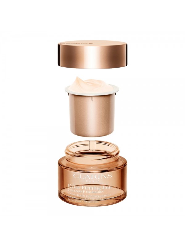 La crema de dia reafirmant de nova generació combina una exclusiva TECNOLOGIA [COLÁGENO] ³ amb tres actius pro-col·lagen: polipèptids de col·lagen, extracte d'arbre de pecà i extracte de mitracarpus bio, que treballen eficaçment per millorar la quantitat, qualitat i estructura del col·lagen, augmentant les seves reserves. En tan sols 7 dies*, la pell llueix visiblement més ferma, amb un efecte lífting que redefineix els contorns del rostre, allisa arrugues i omple els pòmuls. Enriquida amb niacinamida, la molècula de la joventut, millora l'homogeneïtat del to i potencia la lluminositat de la pell. La seva textura envoltant, creada pels Laboratoris Clarins , aporta confort sense sensació greixosa, mentre que el seu format recarregable reforça el compromís amb la sostenibilitat. Una crema dissenyada per tornar fermesa i joventut a la pell, recolzada per innovació i resultats provats. *Prova de consumidors Extra-Firming Jour & Nuit, 107 dones. **Prova ex vivo realitzada en explants de pell. ***Exclusiu de Clarins .