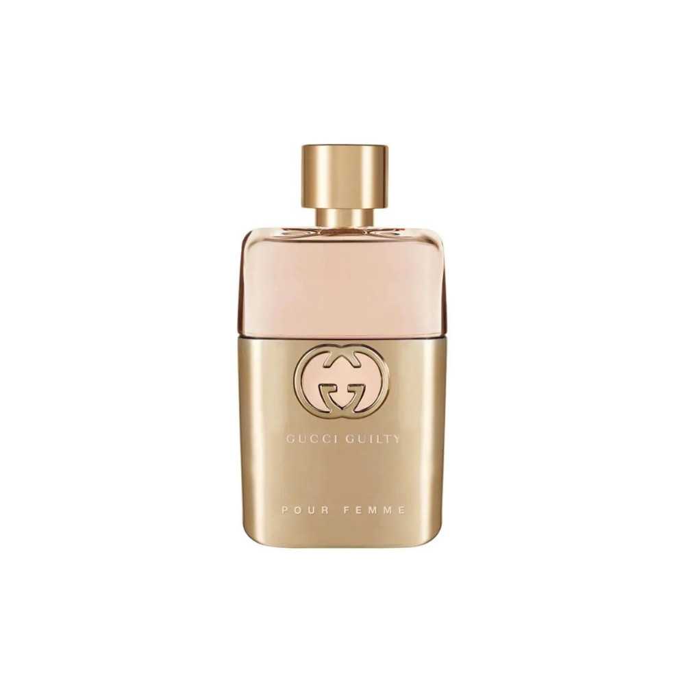 Gucci Guilty Pour Femme Eau de Parfum für Damen, ein unverwechselbarer blumiger Amber-Akkord, wird durch die leichte und frische Weiblichkeit von Fliederblättern mit einem funkelnden Mandora-Zitrus-Touch auf einer Spur reichhaltiger und sinnlicher Noten von Amber und Patschuli definiert.