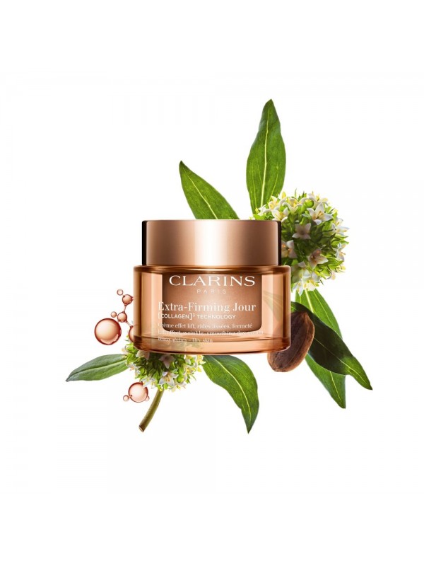 Die straffende Tagescreme der nächsten Generation kombiniert die exklusive [COLÁGENO] TECHNOLOGY³ mit drei Pro-Kollagen-Wirkstoffen: Kollagen-Polypeptiden, Pekannussbaum-Extrakt und Bio-Mitracarpus-Extrakt. Diese verbessern effektiv Menge, Qualität und Struktur des Kollagens und erhöhen dessen Reserven um bis zu 53 %**. Bereits nach 7 Tagen* wirkt die Haut sichtbar straffer, mit einem Lifting-Effekt, der die Gesichtskonturen neu definiert, Falten glättet und die Wangenknochen aufpolstert. Angereichert mit Niacinamid, dem Molekül der Jugend, verbessert die Creme den Hautton und verleiht der Haut mehr Ausstrahlung. Ihre reichhaltige Textur, entwickelt von Clarins Laboratories, sorgt für ein angenehmes Hautgefühl ohne zu fetten. Die nachfüllbare Verpackung unterstreicht das Engagement der Marke für Nachhaltigkeit. Eine Creme, die der Haut Festigkeit und Jugendlichkeit zurückgibt – basierend auf Innovation und nachgewiesenen Ergebnissen. *Verbrauchertest Extra-Firming Day & Night, 107 Frauen. **Ex-vivo-Test an Hautexplantaten. ***Exklusiv bei Clarins .