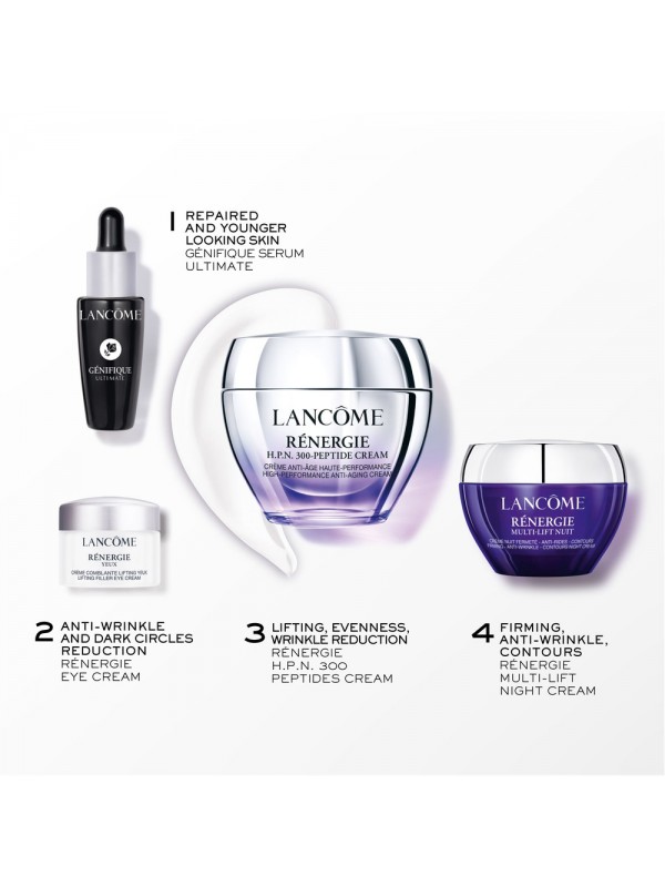 SCHRITT 1: Génifique Ultimate Serum 10 ml – Das neue Génifique Ultimate Serum basiert auf der Beta-Glucan-CM-Technologie, die dafür bekannt ist, die Hautreparatur zu beschleunigen. In Kombination mit Hyaluronsäure, Süßholzwurzelextrakt und unseren legendären prä- und probiotischen Fraktionen bietet diese Formel die ultimative regenerierende Lösung, die auf das Auftreten von Rötungen und feinen Linien sowie auf glattere Haut abzielt. Definitive Ergebnisse hinsichtlich der allgemeinen Hautqualität, der Reparatur der Hautbarriere und der frühen Anzeichen der Hautalterung. SCHRITT 2: Rénergie Augenkonturcreme 5 ml – Die hohe Anti-Aging-Wirksamkeit von Rénergie, entwickelt für die empfindliche Haut um die Augen. Eine einzigartige Konzentration von Hyaluronsäure der nächsten Generation, ausgewählt aufgrund ihrer geringeren Molekülgröße, und der in unserem französischen Leinsamenextrakt enthaltenen Peptide. Die Augenkontur wird sofort erfrischt und bei regelmäßiger Anwendung werden Fältchen gemildert, die Augenlider angehoben und Augenringe nachhaltig verbessert. SCHRITT 3: Rénergie HPN 300-Peptide Cream 50 ml – Eine einzigartige Konzentration von Hyaluronsäure, unsere Entdeckung von 300 Peptidtypen und die Kraft von Niacinamid in einer hochwirksamen Anti-Aging-Creme. Diese innovative Peptidcreme hilft, sichtbare Zeichen der Hautalterung wie Falten, dunkle Flecken und die Festigkeit des Gesichts zu verbessern. Außergewöhnliche Ergebnisse, die in allen klinischen Parametern bestätigt wurden. Zum Abschluss verwenden Sie die Rénergie Multi-Lift Nachtcreme 15 ml – eine nährende, umhüllende Nachtcreme, die die Haut Ihres Gesichts und Halses glättet. Es kombiniert Hyaluronsäure, Leinsamenextrakt und 6 verschiedene Lipide, um nachts zu wirken, wenn die Hauterneuerung ihren Höhepunkt erreicht. Verbesserte Feuchtigkeitsversorgung und klinisch nachgewiesene Ergebnisse bei 5 Arten von Falten: Stirnfalten, Krähenfüße, Augenringe und horizontale Halsfalten*. Die Haut fühlt sich hydratisiert, fester und straffer an, als wäre sie gedehnt worden. Es verfügt über eine luxuriöse, umhüllende Textur, die sich ideal für die nächtliche Gesichtsmassage eignet. *Klinischer Score, 49 Frauen