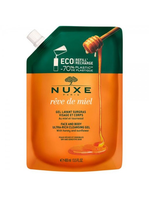 This dermatological cleansing gel, with Honey and Sunflower, is rich and deliciously honeyed, providing daily care for dry and sensitive skin while respecting the hydrolipidic film. It cleanses the face and body without drying. Its texture and fragrance offer a truly enveloping experience in the shower. This new format, with at least 70% plastic*, allows you to refill your 400ml bottle of dermatological cleansing gel. Formulated and manufactured in France. *Compared to the classic 400ml Dermatological Cleansing Gel bottle