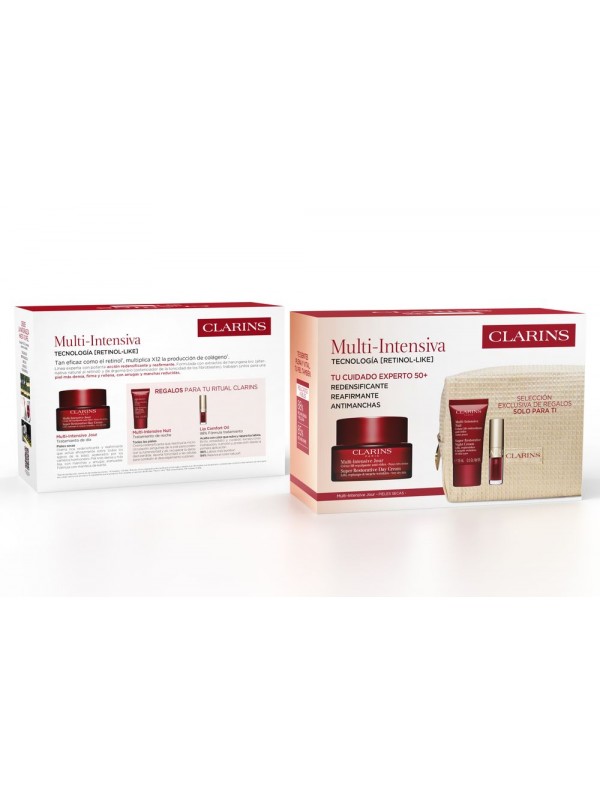 The Clarins Multi-Intensive Gift Set for dry skin offers an expert solution for the needs of mature skin that shows loss of density, dryness, and lack of radiance. It includes the Multi-Intensive Day Cream for Dry Skin, which redensifies, intensely nourishes, and protects against signs of aging; the Multi-Intensive Night Cream (15ml), which regenerates and strengthens the skin while you sleep; and the Mini Lip Comfort Oil, which moisturizes and beautifies the lips. Formulated with plant extracts such as organic harungana, this set provides comprehensive anti-aging action, intense nourishment, and redensifying treatment for visibly firmer, more comfortable, and radiant skin.
