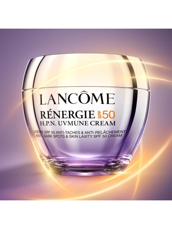 Lancôme 's Rénergie HPN UVMUNE SPF 50 combines advanced sun protection with powerful anti-aging action. With over 300 peptides, hyaluronic acid, and niacinamide, it prevents wrinkles, dark spots, and loss of firmness. Its lightweight formula protects against harmful UVA rays, caring for your skin every day.