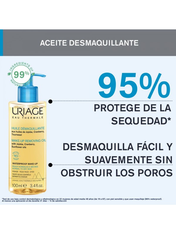 URIAGE CLEANSING OIL. Uriage Cleansing Oil perfectly removes all types of makeup, oil, and other impurities accumulated throughout the day. Skin is left clean, smooth, soft, and supple. This formula contains 99% naturally derived ingredients and is biodegradable.