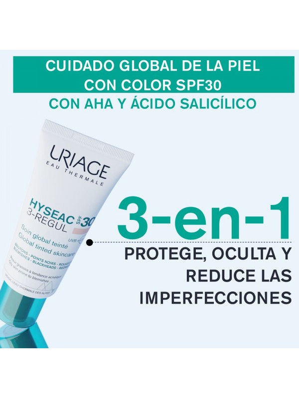 HYSÉAC 3-REGUL TRIPLE ACTION GLOBAL CARE WITH COLOR SPF 30+. This all-in-one global treatment reduces the appearance of skin imperfections (pimples, blackheads), naturally evens out the complexion, and limits the appearance of sun-related marks thanks to its SPF 50+ sun protection factor.