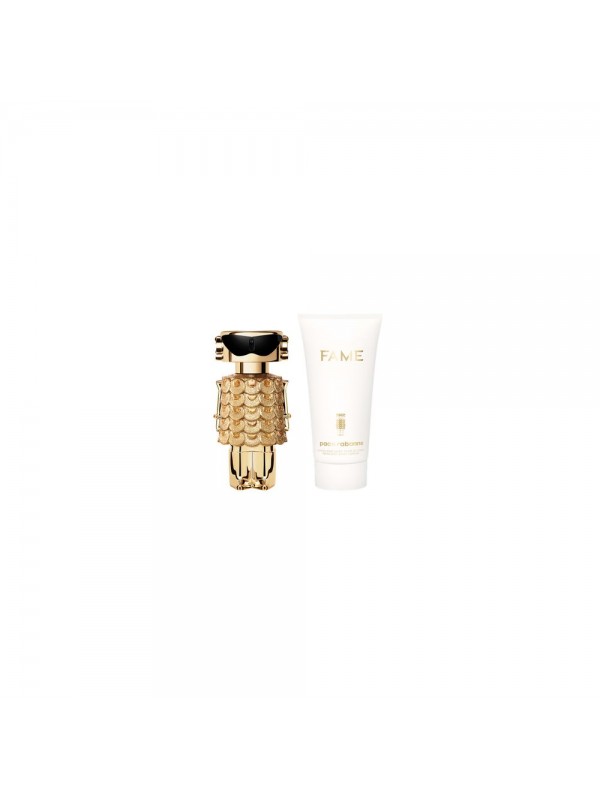 This gift set contains a Fame Eau de Parfum 80 ml, a Body Lotion 100 ml and a miniature 4 ml.Discover Fame, the iconic feminine fragrance from the Maison Rabanne. Capturing the irresistible Parisian spirit of the Rabanne woman, Fame perfume pays homage to a new era of femininity. Playful. Sensual. Powerful. Quintessentially avant-garde luxury, this perfume is a blend of exceptionally pure jasmine, succulent mango and addictively sensual creamy incense. A refillable fragrance created for all women. Fame by Rabanne invites you to experience all the femininities you want, to let yourself shine in all your facets, giving off a scent as unique and brilliant as you are. Show off your Fame.