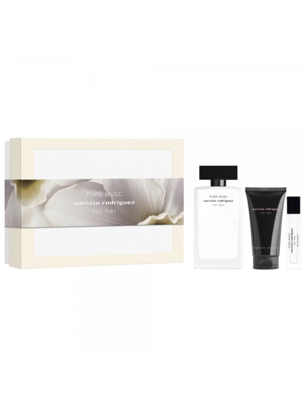 Gift box for her PURE MUSC eau de parfum by Narciso Rodriguez For Mother's Day, Narciso Rodriguez presents a unique design that offers a modern reinterpretation of flowers. Seal your love and cherish your family with this thoughtful gesture.This box includes: - 1 for her PURE MUSC eau de parfum 100 ml - 1 for her body lotion 50 ml - 1 for her PURE MUSC eau de parfum travel size 10 mlA delicate feminine perfume As the most tender interpretation of the for her fragrance, for her PURE MUSC is an addictive women's eau de parfum that plays with a duality of darkness and light. This provocatively pure essence can be worn alone for a hypnotic effect or layered with other for her fragrances for an even more captivating result.An essential musky chypre perfume Revealing the true nature of musk, for her PURE MUSC explores the essence of Narciso Rodriguez's iconic signature in this sensual eau de parfum. The heart of musk expresses its most essential facets, while a bouquet of orange blossom, jasmine, and ylang-ylang infuses the fragrance with stunning floral accents. Cedarwood adds comforting warmth with its enveloping woody notes.A 100% cardboard gift box, more responsible Less is more with the 100% cardboard box. Narciso Rodriguez has designed its packaging with a more environmentally conscious approach. We encourage you to give your gift boxes a second life by reusing them. * Recycling guidelines may vary by location.
