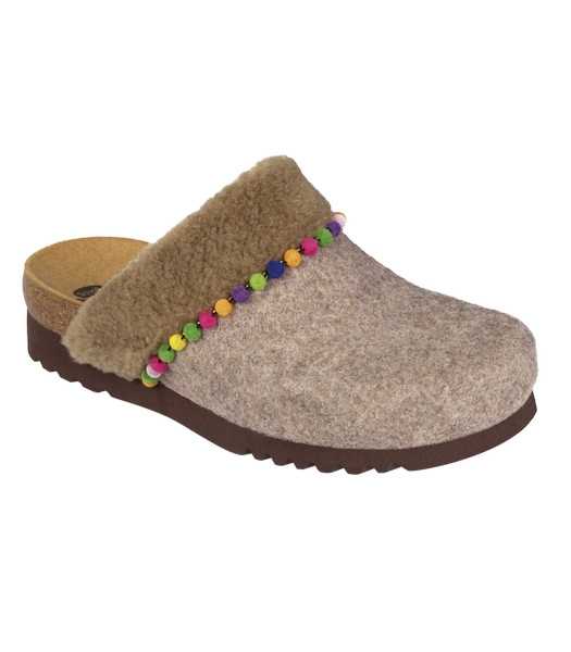 LIBBY has a soft faux fur trim and a series of small colored pom poms. The upper part is made of very soft felt and the sole is non-slip. The shoe is also flexible, lightweight and has a cork and rubber insole with Scholl Bioprint® technology to help keep the foot in the correct position. The Scholl Bioprint® insole now has a soft core that will give your walk even more comfort thanks to its new formula.