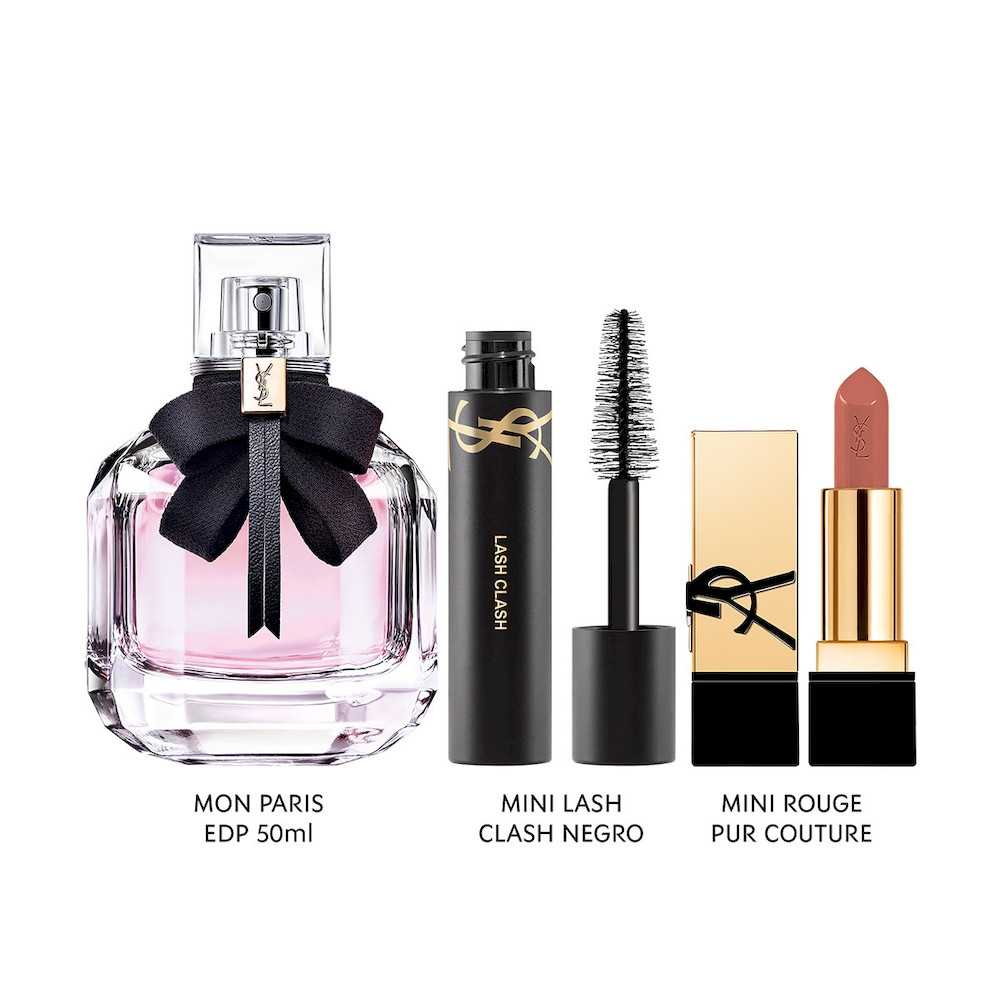 En esta mágica temporada navideña, YSL Beauty te invita a adentrarte en un reino de fantasías de hielo, donde la sofisticación se encuentra con la festividad. Deja que la luz dorada del emblemático copo de nieve de Yves Saint Laurent te guíe hacia esta experiencia única con nuestros cofres navideños. Dentro de este exclusivo cofre para regalar encontrarás: • Mon Paris Eau de Parfum 50 ml: una fragancia femenina que combina la excitante flor de datura con la feminidad de las flores blancas y la sensualidad del almizcle. Es un perfume ideal para las mujeres amantes de los aromas dulces y suaves como los de la fresa, la frambuesa, la pera y la naranja. • Mini Lash Clash Black • Mini Rouge Pur Couture