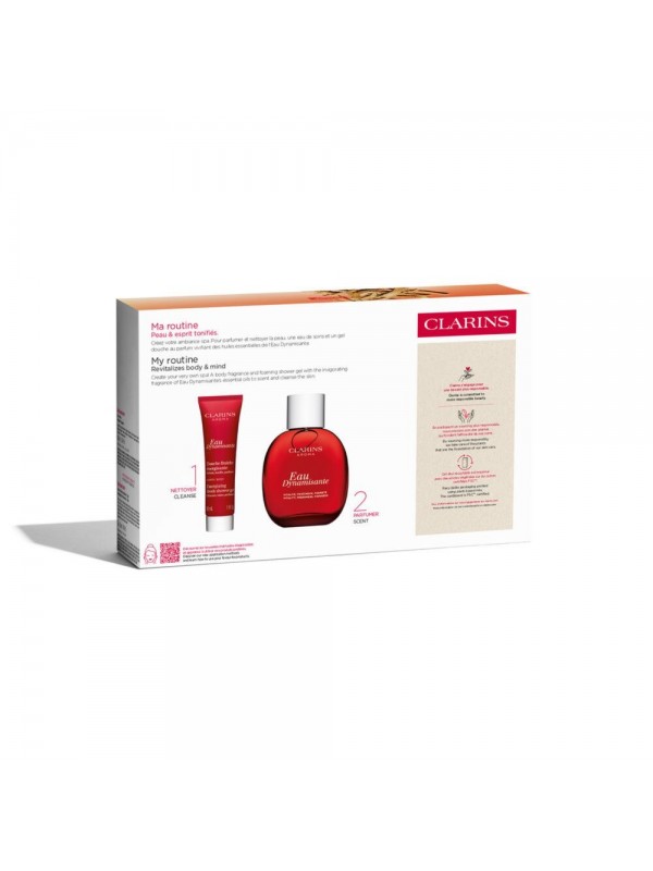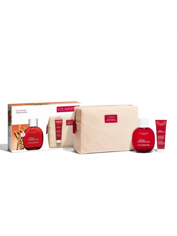 Este cofre reúne la mítica Eau Dynamisante, la primera agua de tratamiento de Clarins, y un tratamiento corporal con perfume revitalizante: un gel de ducha enriquecido con extracto de aloe vera. Este ritual de energía perfuma, revitaliza y tonifica el cuerpo y la mente. Es perfecto para empezar bien el día o combatir la fatiga temporal. Todos estos tratamientos se presentan en un gran neceser.
