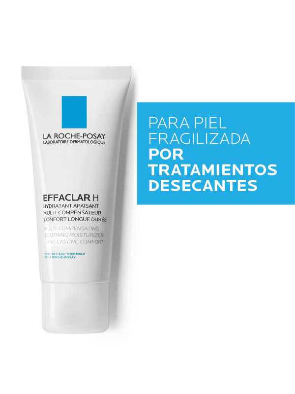 Effaclar H de La Roche-Posay es una hidratante calmante multi-compensadora, especialmente formulada para pieles grasas con acné fragilizadas por tratamientos desecantes tales como isotretinoína oral. Calma e hidrata la piel, devolviéndole todo el confort.Eficacia probada: • Desde la primera aplicación, calma la piel intensamente y recupera el confort y la elasticidad. Las zonas secas, las rojeces y las escamas se reducen de manera visible; la piel está más lisa al tacto. • Se reduce un 64% la sequedad de la piel*.Formulación experta: • MP-LÍPIDOS: Nueva generación de lípidos que ayudan a reconstruir la barrera de la piel en sus diferentes dimensiones, devolviéndole la hidratación.