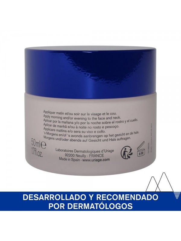 Crema antiedad global que corrige todos los signos de envejecimiento. Crema redensificante para el rostro y el cuello que reduce visiblemente las arrugas con un potenciador de procolágeno x6*. Crema facial aterciopelada rosada que proporciona una hidratación intensa y confort. Formulada con Ácido Hialurónico, nuestra crema global anti-envejecimiento ofrece hidratación, mejorando la vitalidad y flexibilidad de la piel.Ingredientes recomendados por dermatólogos en una sola fórmula: Péptidos de procolágeno, Retinol, Vitaminas C y E, Ácido Hialurónico y Manteca de Karité para una reducción efectiva de arrugas y rejuvenecimiento de la piel. Patente exclusiva antienvejecimiento que ayuda a reducir el daño celular.Crema antiedad para pieles maduras y en la menopausia, perfectamente apta para pieles sensibles. Aplicación diaria anti-arrugas por la mañana y/o por la noche.Apta para pieles sensibles - No comedogénica - 91% de ingredientes de origen natural.Los productos de Uriage, desarrollados en colaboración con dermatólogos, ofrecen una amplia gama de cuidados de la piel de alta tolerancia adecuada para distintos tipos de piel, incluyendo piel extra seca, sensible, madura, grasa y propensa al acné, adaptándose a personas de todas las edades.*Nivel de proteína procolágeno 1: estudios in vitro en fibroblastos