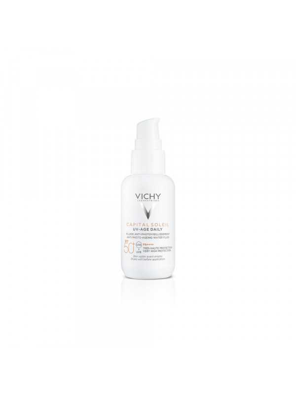 UV-AGE DAILY es un fotoprotector diario de rostro que proporciona muy alta protección frente a los rayos UVB y UVA para prevenir los signos del fotoenvejecimiento como manchas y arrugas. Con eficacia antipolución. En una textura water fluid ultraligera de rápida absorción con un acabado invisible mate sin trazas blancas.El 80% de los signos de la edad se deben a los factores externos del Exposoma, entre ellos la radiación solar, que representa uno de los factores que mayor impacto tiene en la salud de la piel, responsable entre otras cosas del fotoenvejecimiento diario. La protección diaria de la piel frente a la radiación solar es fundamental para mantener un aspecto más joven y saludable.El sol emite diferentes tipos de radiaciones, entre ellas las más importantes por sus efectos biológicos son la radiación UVB y UVA. Cada radiación interactúa de forma diferente en la piel. La radiación UV es la radiación más energética que llega a la superficie de nuestra piel y en contraposición es la menos penetrante de todas ellas. En el caso de la radiación UVB su acción es fundamentalmente en la epidermis, sin embargo, la UVA es capaz de penetrar en capas más profundas de la piel. En ambos casos, pueden provocar daño directo sobre nuestra piel y un efecto indirecto con el incremento del estrés oxidativo (aumento de los radicales libres). Además, debemos tener en cuenta que el sol no es un factor aislado. Además del efecto que produce la radiación solar, debemos conocer la interacción con otros factores. Una relación que se ha demostrado es la que existe entre la radiación solar y la contaminación. La combinación de ambos factores, lo que se conoce como fotopolución acelera el proceso natural de envejecimiento de la piel.EFICACIA EN FOTOPROTECCIÓNTecnología NETLOCK que recubre la fase oleosa y los filtros, aumentando la estabilidad de la fórmula, consiguiendo un reparto homogéneo de los filtros en una fina capa. Alta resistencia al agua y al sudor. No migra a los ojos. SISTEMA FILTRANTE CON MEXORYL XL Muy alta protección UVB SPF 50+, unido a nuestra mayor protección UVA: UVA-PF 46. Protección de amplio espectro. Antioxidante: Reduce un 95% la peroxidación del escualeno*. Antipolución: textura anticontaminación Protección frente a los daños causados por la radiación infrarroja. *Estudio exvivo, cuantificación del ratio de peróxido de escualeno.EFICACIA EN TRATAMIENTO Con péptidos antiedad y vitamina B3 (NIACINAMIDA) para ayudar a prevenir arrugas y manchas. Además, gracias a la acción sinérgica del Agua Volcánica de Vichy, y junto a las Fracciones Probióticas, protege la función barrera de la piel**. **Medida instrumental de TEWL, 24 sujetos, 1 aplicación.Máxima sensorialidad en la aplicación gracias a su textura water fluid ultraligera y transpirable de rápida absorción para un acabado invisible mate. UV AGE es además una fórmula testada bajo control dermatológico y oftalmológico. No pica en los ojos*. Hipoalergénico y apto para todo tipo de pieles, incluso pieles sensibles (*Formulado para minimizar el picor de los ojos).