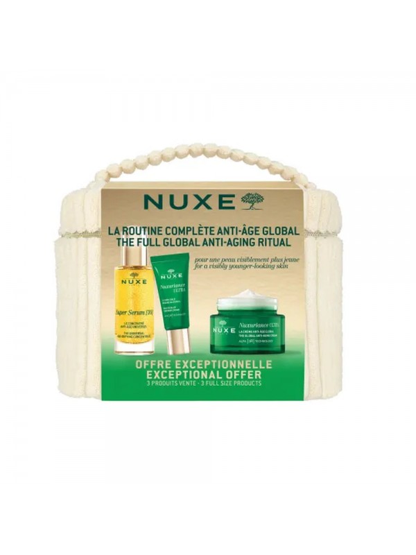 Descubre la rutina completa antiedad global, con Super Serum [10] que multiplica la eficacia de la crema Antiedad Global Nuxuriance Ultra Alfa [3R].El neceser contiene:- Super Serum [10] 30ml: Corrección antiedad intensiva para una piel que funciona como si fuese [10] años más joven*.- Nuxuriance Ultra Alfa [3R] La Crema Antiedad Global 50ml: Revitaliza y reafirma la piel, alisa las arrugas.- Nuxuriance Ultra Alfa [3R] El Tratamiento Específico para Contorno de Ojos y Labios 15ml: Reduce las líneas de expresión, incluso las marcadas, para un contorno de ojos y de los labios alisado, como destensado.*Prueba in vitro.