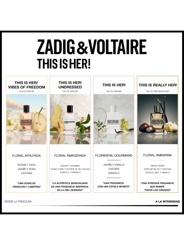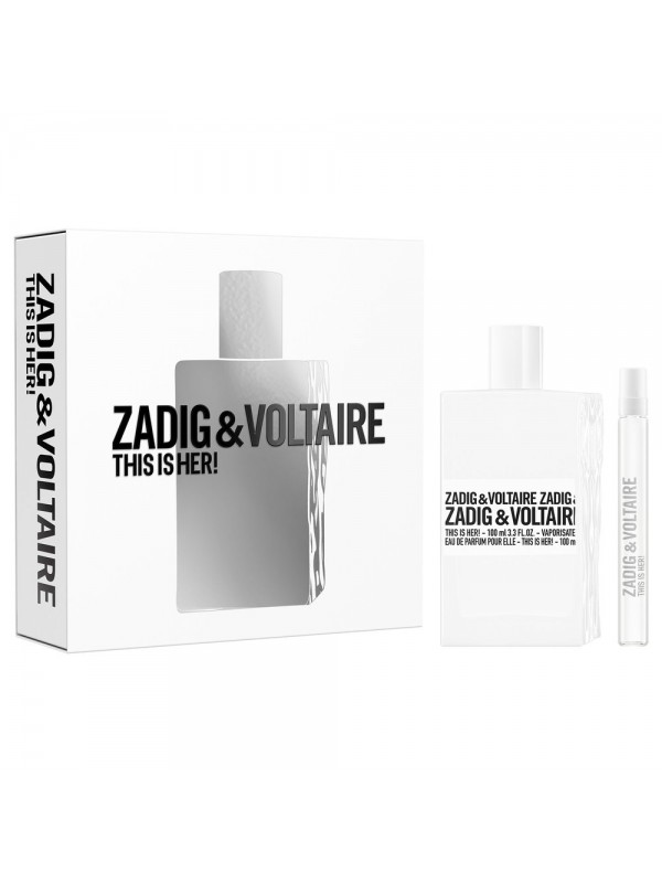 Coffret Zadig & Voltaire This is Her!. Le coffret Zadig & Voltaire This is Her! est un choix idéal pour l'automne. Ce parfum féminin, de la famille des parfums orientaux vanillés, offre un riche mélange d'ingrédients. Ses notes de tête, composées de poivre rose, de jasmin d'Arabie (Sambac) et d'arbre à soie, s'ouvrent sur une fraîcheur délicate. Le cœur, aux notes de châtaigne, de vanille et de crème fouettée, révèle ensuite une fragrance chaleureuse et sucrée. Le fond, composé de bois de cachemire et de santal, apporte une touche douce et terreuse. Ce coffret est cruelty-free : ce produit n'a pas été testé sur les animaux. Laissez-vous envoûter par le parfum de Zadig & Voltaire This is Her! et sublimez votre garde-robe d'automne. Outre l'eau de parfum, ce coffret contient un vaporisateur de voyage pratique.