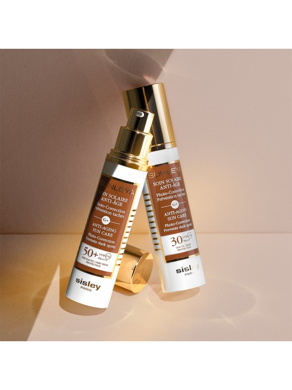 Sunleÿa, l'excellence anti-âge en matière de protection solaire. Correction photo : lignes d'expression - Élasticité. Prévention des taches.Offrant une haute protection anti-âge, Sunleÿa SPF30 apporte une solution inédite* contre le photovieillissement. Le soleil intensifie la glycation, accélérant ainsi le vieillissement cutané. Cette crème solaire innovante combat la glycation**, agit sur les rides d'expression et la perte d'élasticité, pour protéger la peau et obtenir un bronzage lumineux, sans altérer l'aspect jeune de la peau.1. Une double action anti-âge : prévention et correctionLe nouveau complexe G+, une gamme d'ingrédients anti-âge clés d'origine naturelle (extrait d'Hypnea musciformis, solution de biosaccharides et adénosine), offre des résultats rajeunissants visibles :Une action contre les effets nocifs de la glycation** pour aider à limiter les dommages photo-induits causés par les rayons UV et améliorer l'élasticité de la peau, réduisant ainsi l'apparence des rides. Une action photocorrectrice innovante pour atténuer les signes du vieillissement 2. Protection solaire anti-âge avancéeLes écrans solaires à large spectre offrent une protection optimale contre les rayons UVA/UVB. L’hydroxytyrosol d’origine végétale, l’extrait d’edelweiss et l’extrait de muguet renforcent la capacité naturelle de la peau à se protéger et à se défendre.** L'extrait de feuille d'hamamélis, un puissant actif contre l'élastose solaire, contribue à préserver l'élasticité de la peau. La vitamine B3 contribue à un teint uniforme.*chez Sisley **test in vitro