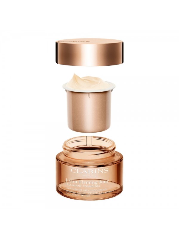 La crème de jour raffermissante nouvelle génération associe une technologie exclusive [COLÁGENO] ³ à trois actifs pro-collagène : des polypeptides de collagène, de l'extrait de noyer et de l'extrait de mitracarpus bio. Ces actifs agissent efficacement pour améliorer la quantité, la qualité et la structure du collagène, augmentant ses réserves jusqu'à 53 %**. En seulement 7 jours*, la peau paraît visiblement plus ferme, avec un effet liftant qui redéfinit les contours du visage, lisse les rides et repulpe les pommettes. Enrichie en niacinamide, la molécule de jeunesse, elle améliore l'uniformité du teint et ravive l'éclat. Sa texture riche, créée par les Laboratoires Clarins , offre un confort optimal sans effet gras, tandis que son format rechargeable témoigne de l'engagement de la marque en faveur du développement durable. Une crème conçue pour redonner fermeté et jeunesse à la peau, fruit d'une innovation aux résultats prouvés. *Test consommateur Extra-Fermeté Jour & Nuit, 107 femmes. **Test ex vivo réalisé sur explants cutanés. ***Exclusivité Clarins .