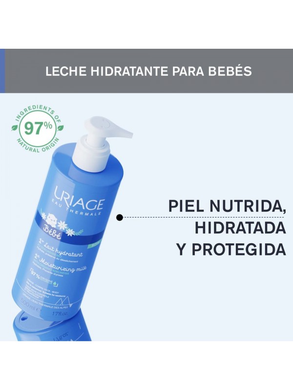 " [LECHE HIDRATANTE] : Cette émulsion fondante, non grasse et légèrement parfumée hydrate intensément la peau délicate de bébé et prévient le dessèchement.[INGREDIENTES HIDRATANTES] Sa formule, qui comprend le complexe naturel [Agua Termal de Uriage + Edelweiss bio] combiné au beurre de karité et au squalène végétal, crée un film protecteur et une action nourrissante longue durée.[SEGURIDAD] : Recommandé par les pédiatres - Convient aux nouveau-nés - Haute tolérance - 97 % d'ingrédients d'origine naturelle[MARCA RECOMENDADA POR LOS DERMATÓLOGOS] : Les produits Uriage, développés en collaboration avec des dermatologues, offrent une large gamme de soins haute tolérance adaptés à différents types de peau, y compris les peaux très sèches, sensibles, matures, grasses et à tendance acnéique, et conviennent aux personnes de tous âges.*Utiliser le test sous surveillance pédiatrique - 30 nourrissons et enfants (de 6 mois à 6 ans) pendant 30 jours - évaluation clinique par des pédiatres.